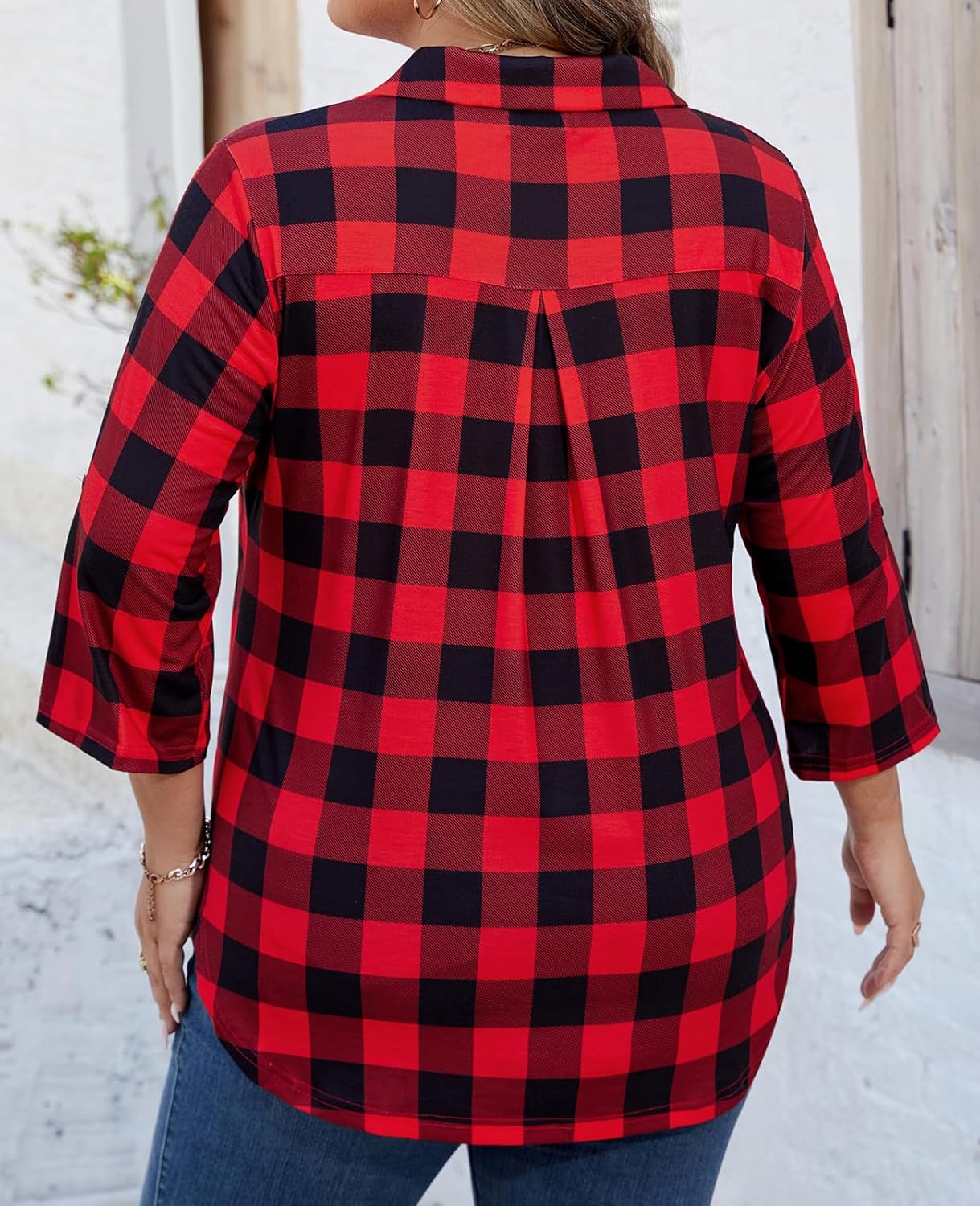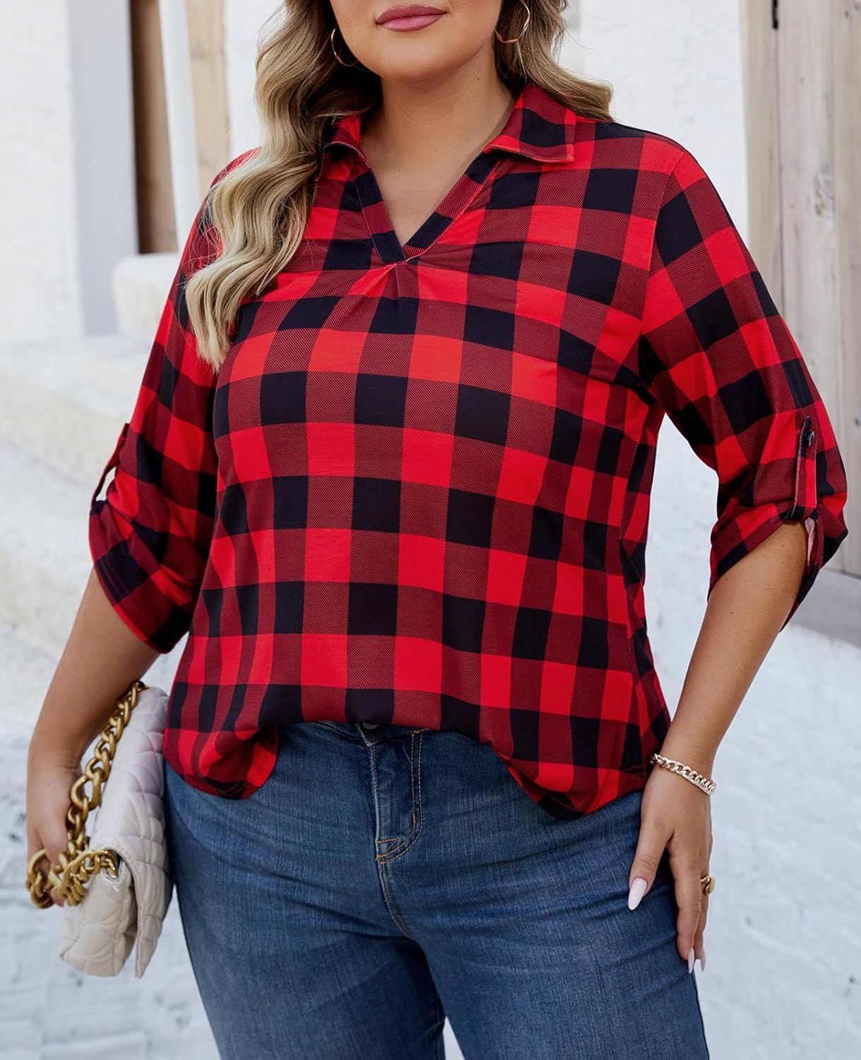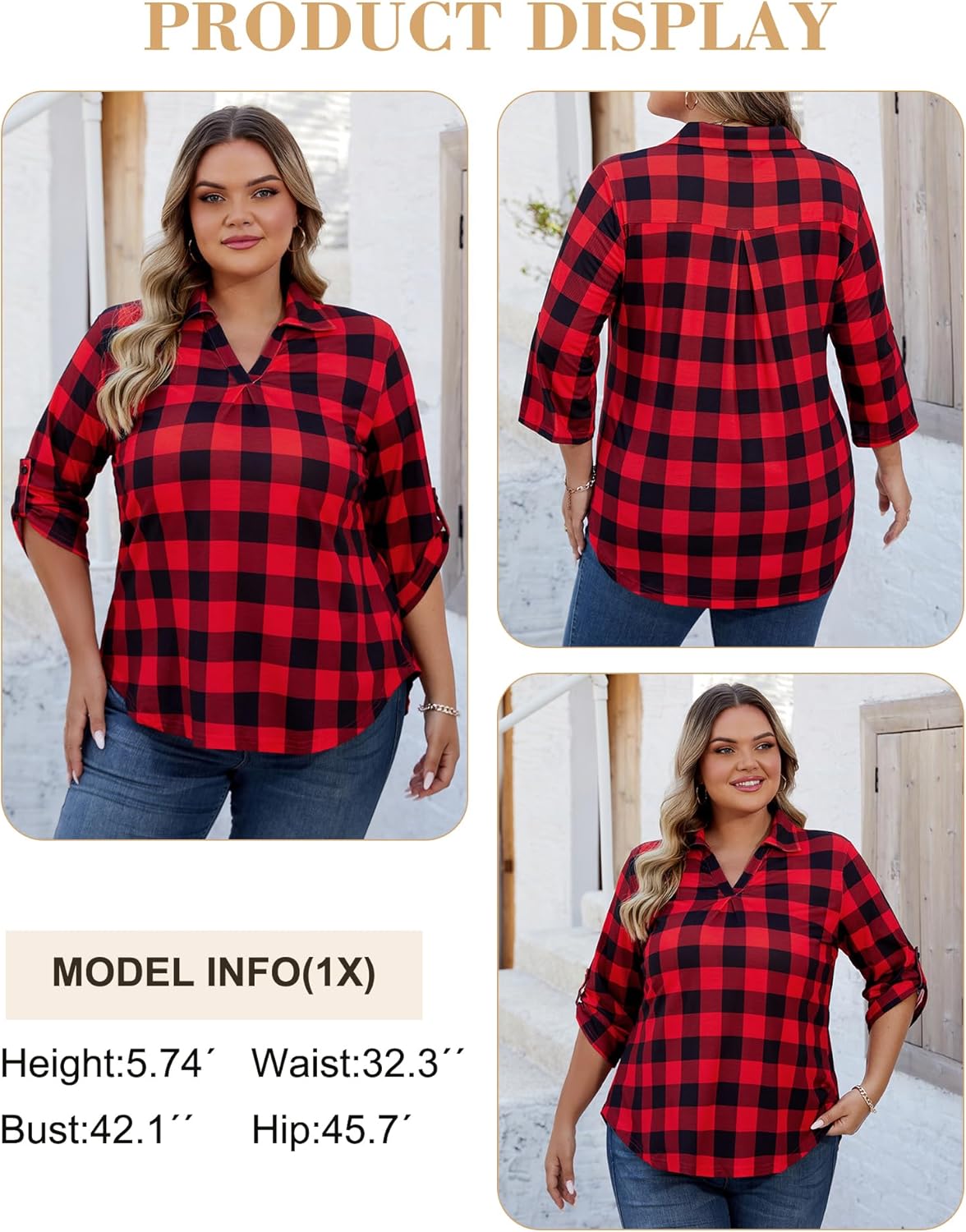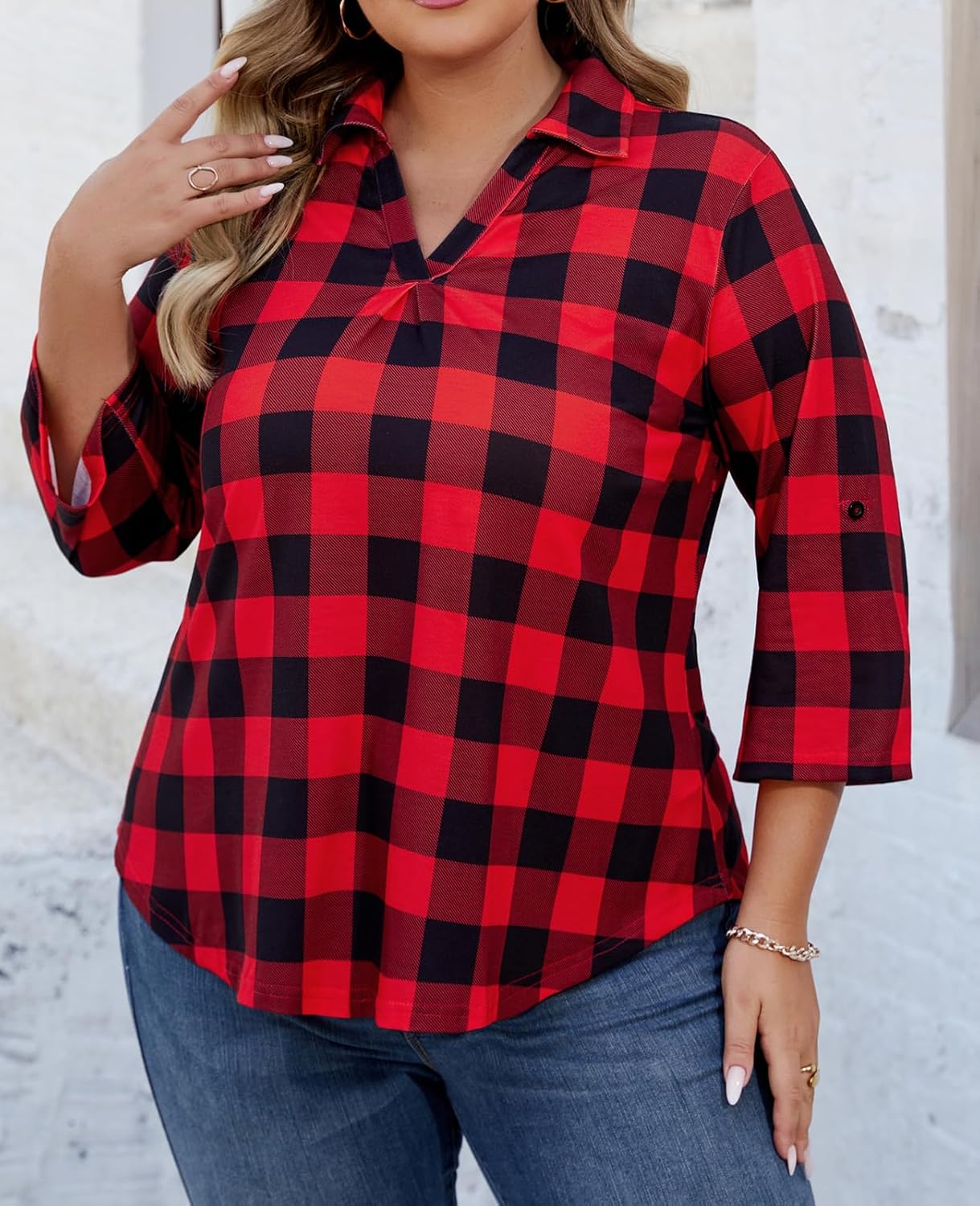 - 【FEATURES】Womens plus size tops features A-line silhouette, 3/4 sleeve design that can be rolled up or down as needed. V neck with a collar, waist-slimming curved hem, a flowy length that provides coverage for the belly and hips, making you look slimmer